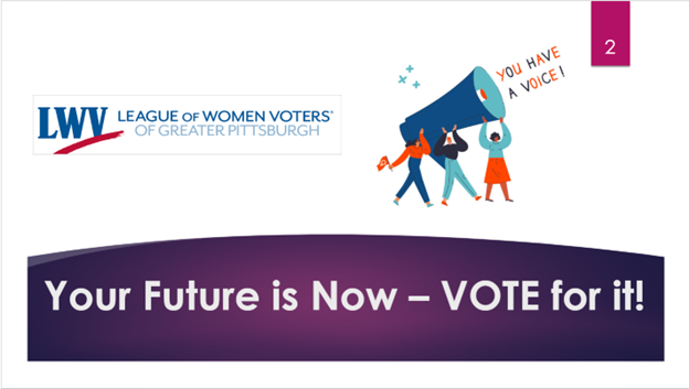 Allegheny County-specific information may be included. Before revising the PowerPoint presentations or individual slides, we make a friendly request that all users adhere to the League of Women Voters’ nonpartisan policy and standards. The League of Women Voters of Greater Pittsburgh is not responsible for revisions that might not meet the nonpartisan and reliability standards of the League of Women Voters.
